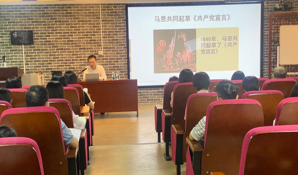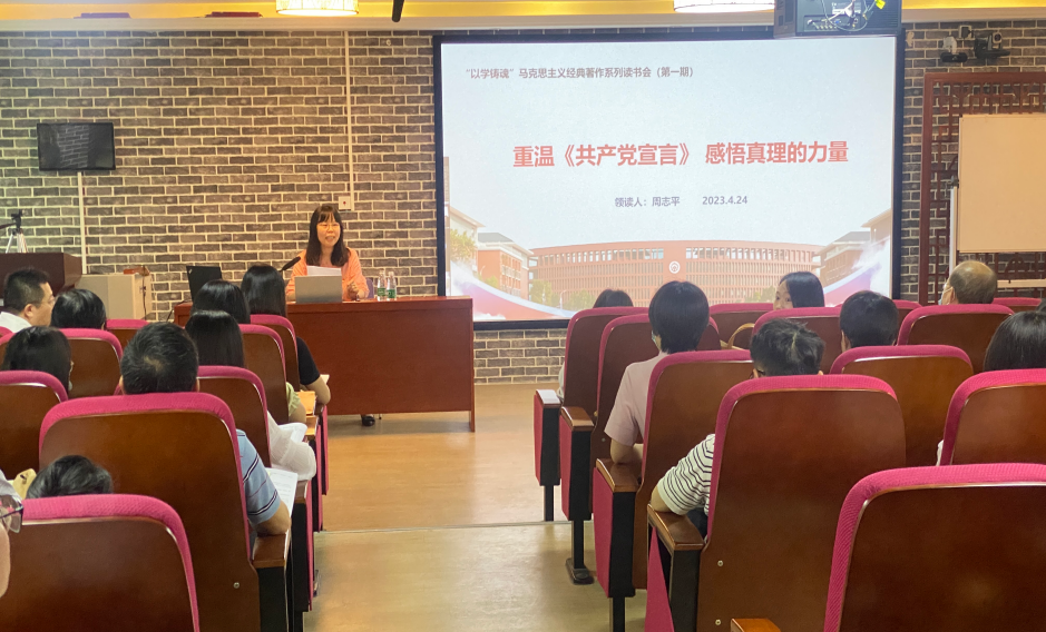 4月24日下午,马克思主义学院举办了以“重温《共产党宣言》感悟真理力量”为主题的第一期“以学铸魂”马克思主义经典著作读书会。会议采用分校区集中,线上线下相结合的方式开展,参与人员包括马克思主义学院全体教师(含国际校区)、思政类学生社团学生、团干和青马班学员代表。