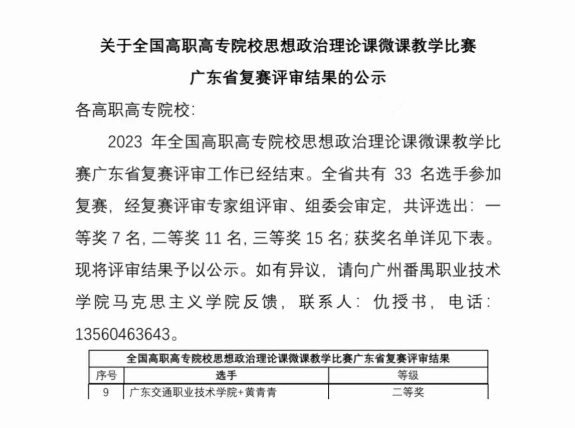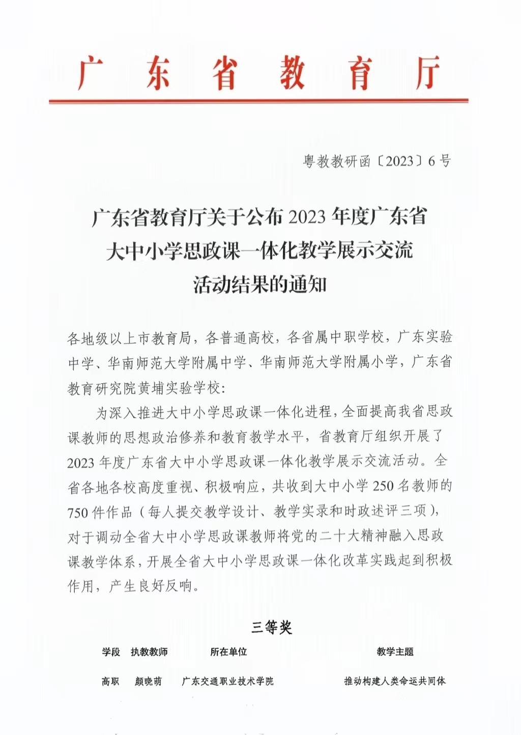 日前,由广东省教育厅主办的2023年度广东省大中小学思政课一体化教学展示交流活动落下帷幕。马克思主义学院颜晓萌老师从全省250位参赛教师的750份作品中脱颖而出,获得广东省三等奖;马克思主义学院黄青青老师获得由广东省高职高专院校思想政治理论建设联盟举办的“高职高专院校思想政治理论课微课教学比赛广东省复赛”二等奖。