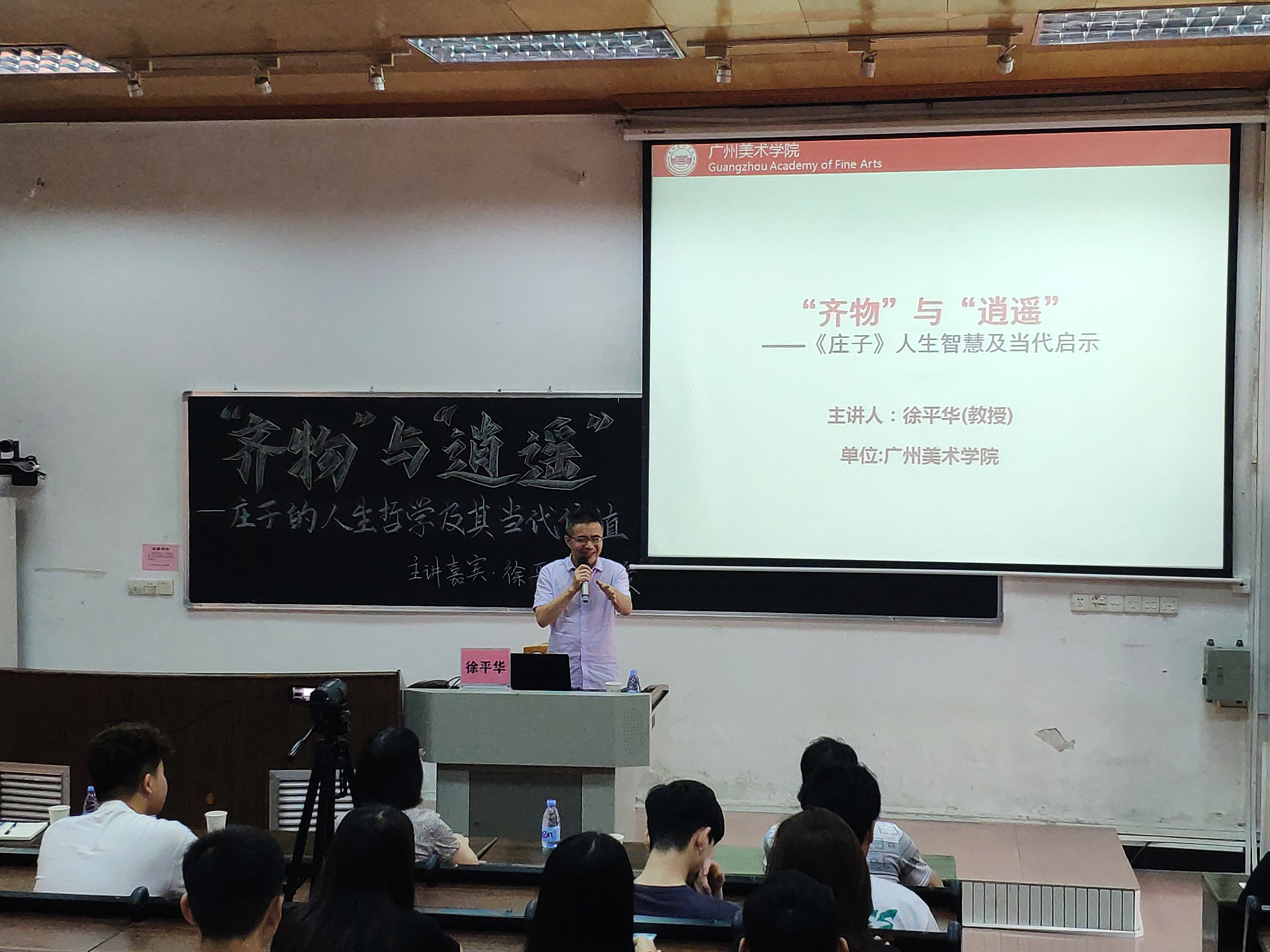 5月16日下午,广州美术学院马克思主义学院副院长徐平华教授莅临花都校区阶梯课室,作了题为“‘齐物’与‘逍遥’——庄子的人生哲学及其当代启示”的报告。徐教授针对当前社会上物质与精神关系紧张的现实问题,深入阐释了庄子人生哲学的核心——“齐物”与“逍遥”的丰富内涵,并提出这一哲学内涵的当代价值,启发当代人由物质上的“富有”转向精神上的“高贵”“逍遥”。