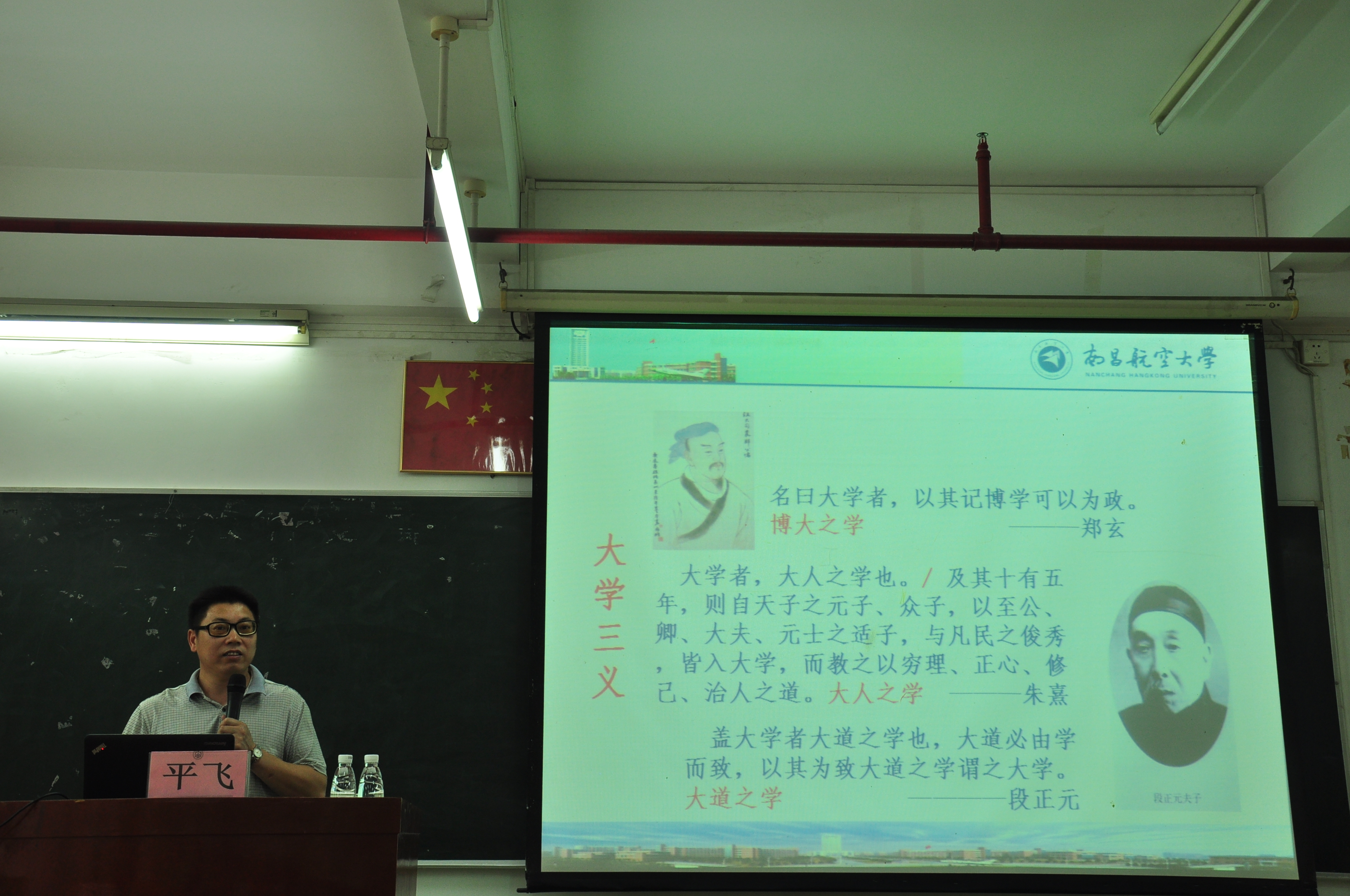 平飞教授,中山大学博士, 南京大学博士后,现为南昌航空大学经济管理学院副院长,中国社会科学院高级访问学者,江西省新世纪百千万人才工程人选,江西省中青年学科带头人,他以其渊博的国学功底和富有激情的演讲,赢得了师生的赞赏。(文/贾如英 图/魏航)