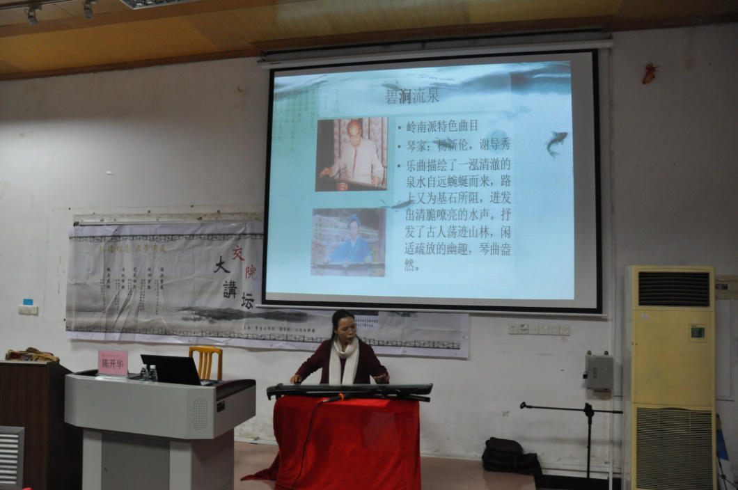 12月12日下午4:30,2016年度人文大讲堂第三讲《艺苑撷英》系列在北校区阶梯教室准时开讲。广东工业大学通识教育中心副教授陈开华博士为全场240多名师生带来了主题为“古琴心韵:琴乐与古代士人情怀”的精彩报告。