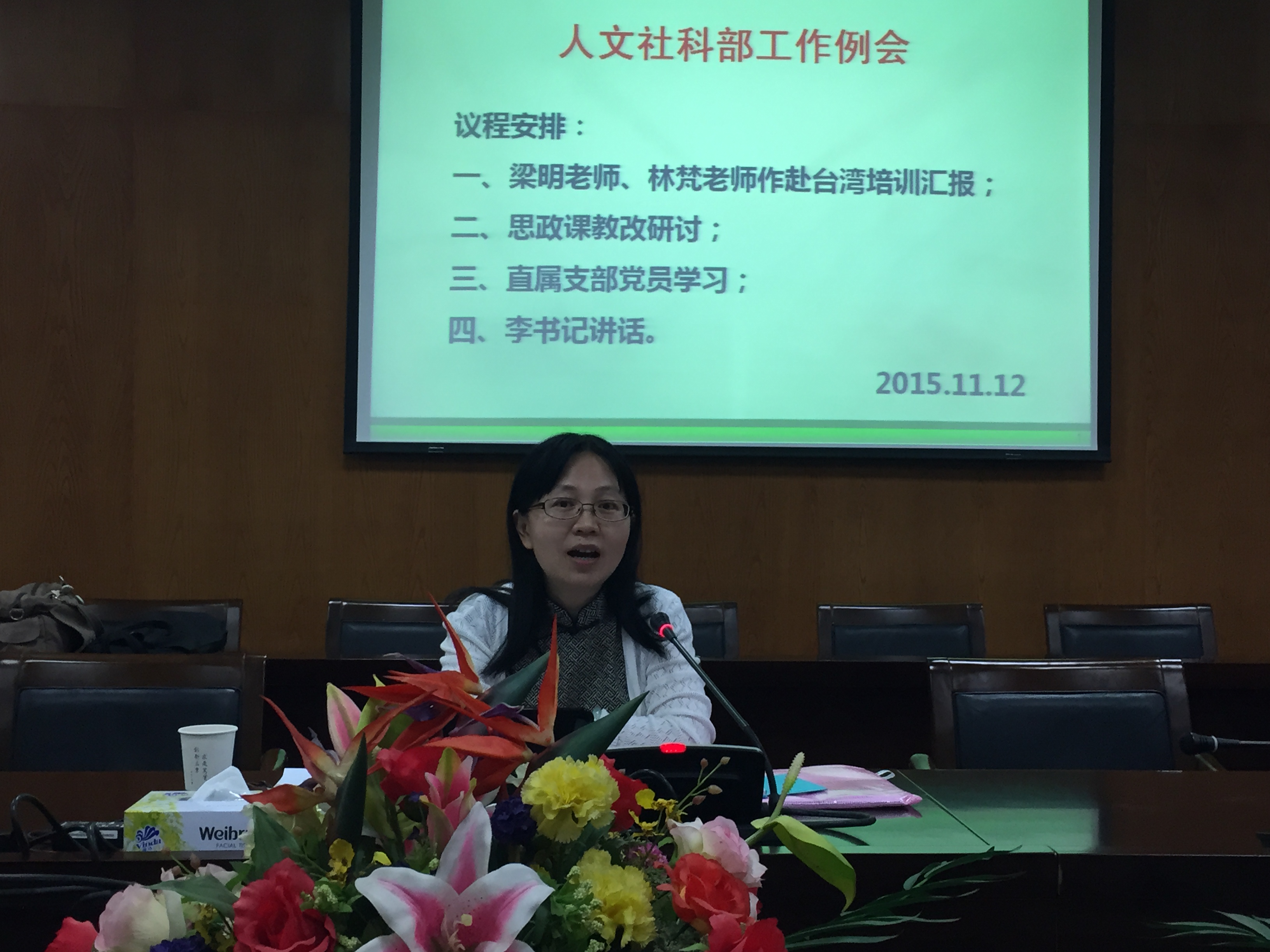 2015年11月12日下午14:00-16:30,人文社科部在天河校区行政楼四楼会议室召开了“人文社科部骨干教师赴台湾培训汇报分享会暨课程教学改革研讨会”,会议由人文社科部陈伟平主任主持,叶华副主任及南北校区的老师们参加了会议。