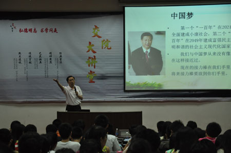 讲座一开始,陈岸涛教授提出了“我们是时代的幸运儿”观点,要求同学们对我们所处的时代有新的认识,明确当下我们的信仰就是完成“中国梦”的理想。陈岸涛教授结合历史发展,紧扣时事热点,从国内环境和国际形势方面详细分析了当代“中国梦”所面临的机遇与挑战,让大家更好地从历史、现实和未来三个维度来认识我们所处的时代,深切感受当代中国的发展及未来走向。陈教授鼓励同学们要将“中国梦”与“青春梦”结合起来,坚定理想信念,脚踏实地,创业创新,写好自己的大学历史!