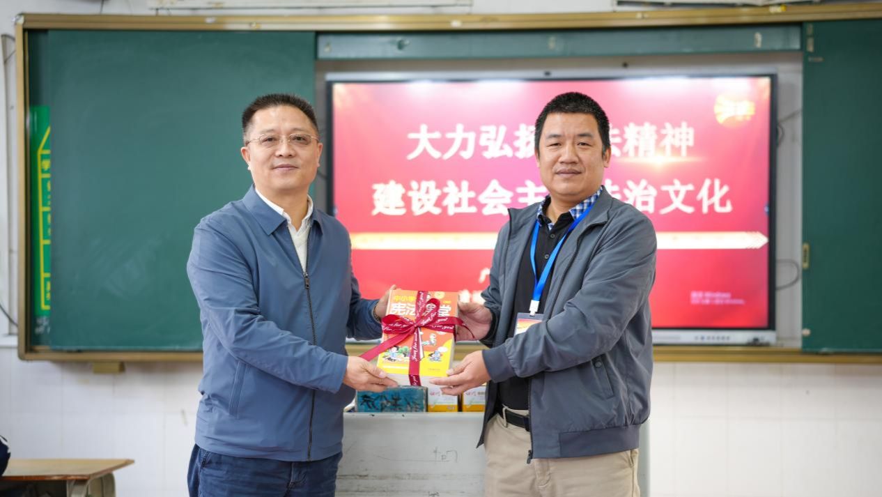 马克思主义学院院长周志平为石潭中心小学六一班孩子赠送宪法书籍并作总结发言。他谈到,党的二十大报告明确指出,全面依法治国是国家治理的一场深刻革命,关系党执政兴国,关系人民幸福安康,关系党和国家长治久安。报告明确了要加快建设法治社会,法治社会是构筑法治国家的基础。