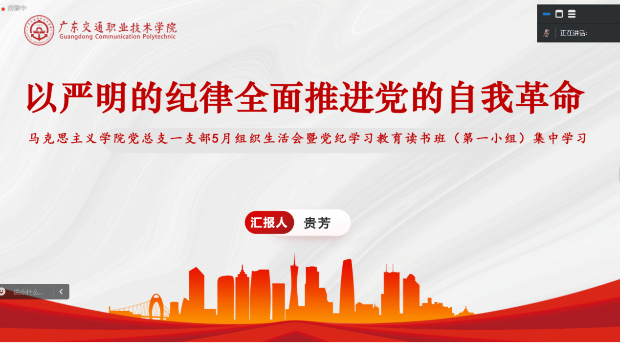 支部纪检委员贵芳作辅导报告。贵老师以《以严明的纪律全面推进党的自我革命》为题,从“法”的视角切入,重点讲授了完善党内法规是法治中国建设的需要,党内法规是中国特色社会主义法治体系的有机组成部分;以严明政治纪律和政治规律、促进执纪执法贯通为重点,通过以案说纪的形式,深入解析了《条例》修订的主旨要义。贵老师指出,广大党员教师要在服务党和国家大局中学习领会《条例》的主旨要义,同时加强党纪教育、增强遵规守纪自觉,弘扬党的光荣传统和优优良作风,把增强党性、严守纪律、砥砺作风融入日常化为习惯。