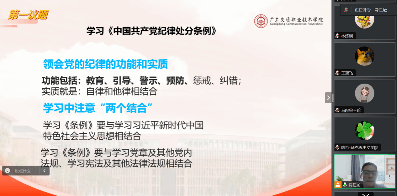 为贯彻落实党中央关于在全党开展党纪学习教育的重大决策部署,深入学习新修订的《中国共产党纪律处分条例》(以下简称《条例》),5月30日下午,马克思主义学院党总支一支部在轨道楼505开展组织生活会暨党纪学习教育读书班(第一小组)集中学习。会议由一支部书记肖仁龙主持,一支部全体党员教师通过线上线下相结合的形式参加会议。