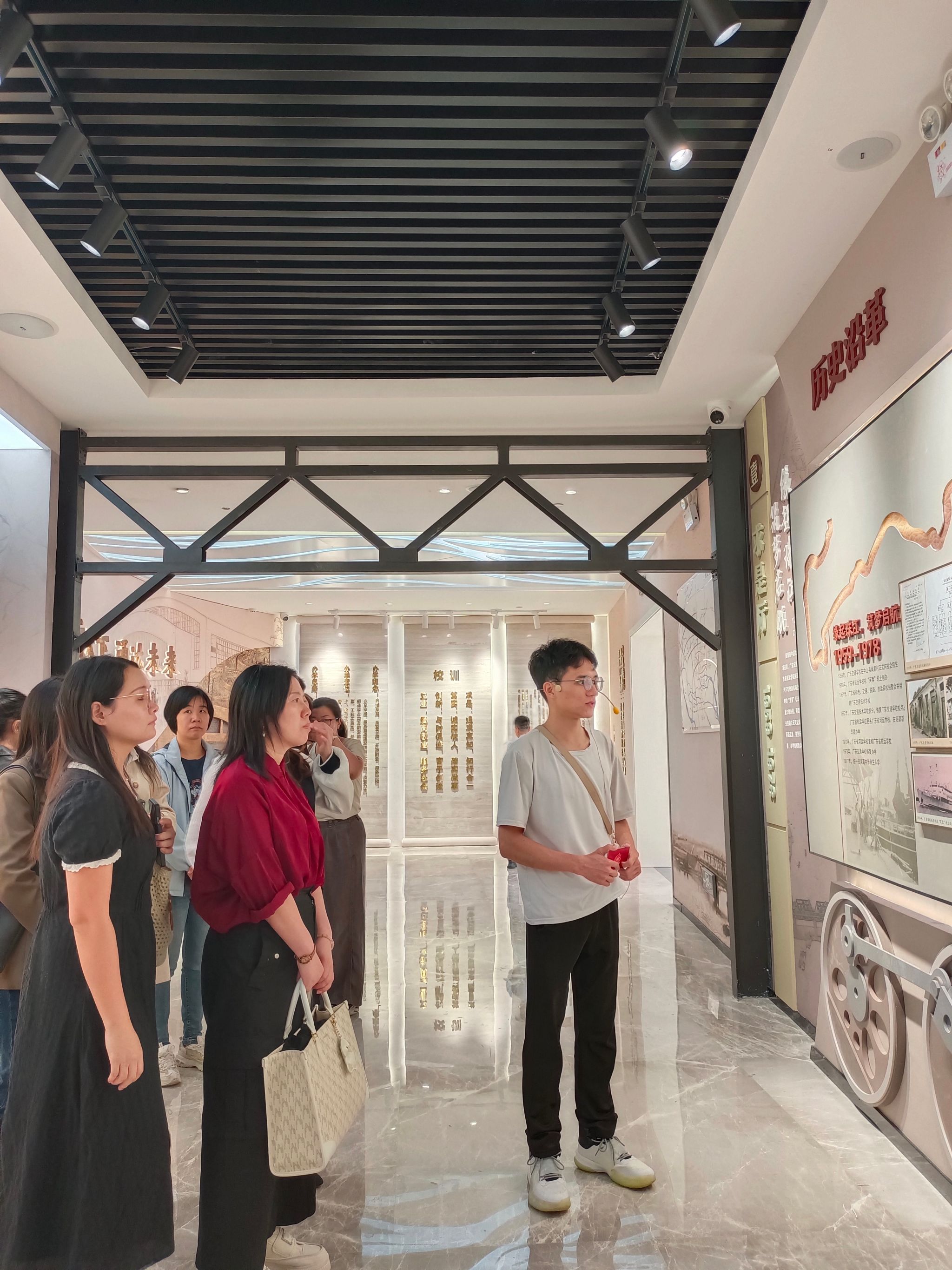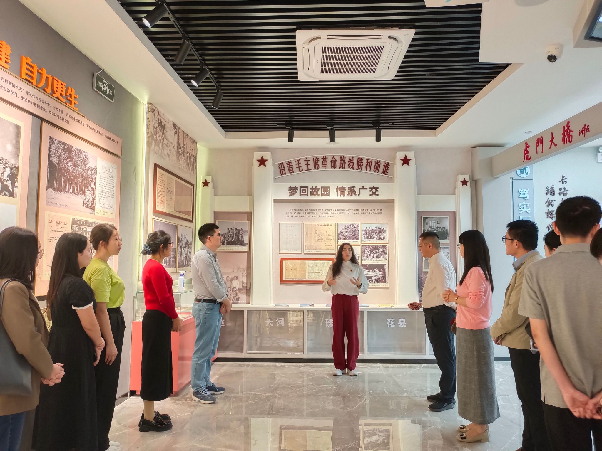 为进一步落实习近平总书记在全国教育大会上的重要讲话精神,深刻领会习近平总书记对学校思政课建设重要指示精神,切实增强思政课教学实效,在我院建校65周年之际,马克思主义学院“习近平新时代中国特色社会主义思想概论”教研室立足党情国情,结合省情校情,进一步深化校史精神融入思政课教学探索,于11月18日在清远校区校史馆沉浸式开展了一次别具风格的“行走的集体备课会”活动。此次活动由马院院长周志平、副院长孙新建、副院长赵爱琴莅临指导,“习概论”教研室全体教师参加。