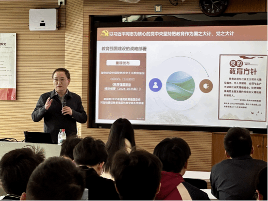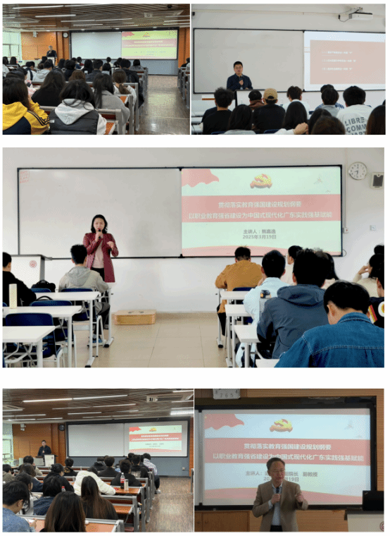 蔡艺、廖金宝、熊嘉逸、王劲松、邱文祥等学院领导为同学们深度解读了《教育强国建设规划纲要(2024—2035年)》,围绕职业教育发展、产教融合和职教出海等内容,详细分析了广东省由职业教育大省稳步迈向职业教育强省发展前景,锚定建设教育强省目标,以教育现代化走在前列支撑广东在推进中国式现代化建设中走在前列;并结合学院理念与成就,鼓舞学生增强自信,牢牢把握职业教育高质量发展契机,苦练本领,立志成为大国工匠、能工巧匠、高技能人才。