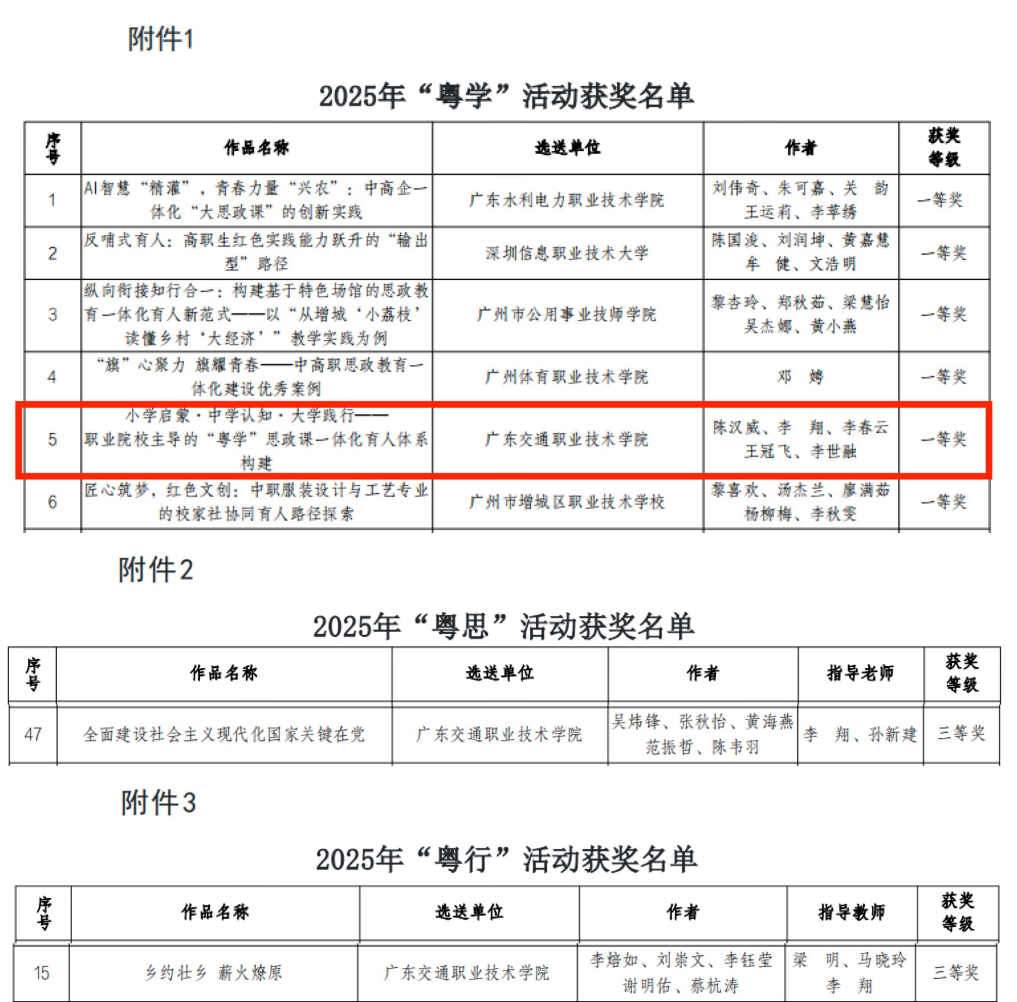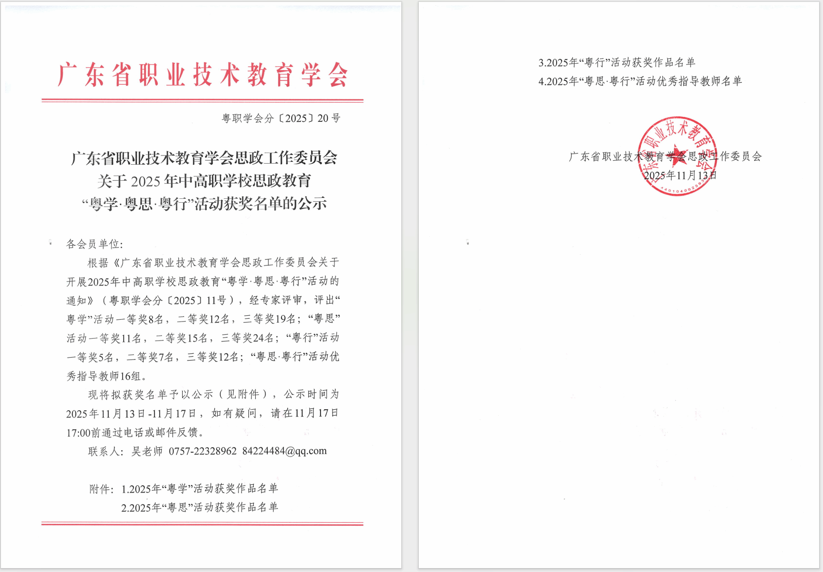 11月13日,广东省职业技术教育学会思政工作委员会公布了关于2025年中高职学校思政教育“粤学·粤思·粤行”活动获奖名单。我院马克思主义学院师生团队在此次活动中表现优异,斩获“粤学”项目一等奖1项、“粤思”和“粤行”项目三等奖各1项,充分展现了学院在思政教育创新实践中的卓越成果。
