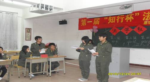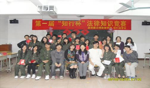 为进一步在我校广泛开展普法宣传教育活动,掀起一场自觉学法、懂法、用法的潮流,增强学生的法制观念,提高学生的综合素质,2010年12月24日,“知行”法学社在北校区教学楼303举行了首届“知行杯”法律知识竞赛。思政部陈伟平主任、梁明老师莅临决赛现场,出席活动的还有法学社的全体社员。