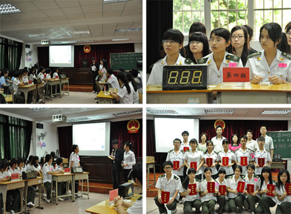 与往届比赛相比,本届决赛的形式更加多样化,在个人必答、抢答环节的基础上,创新性地加入了视频案例分析、风险转嫁、亲友团抢答等环节。简短的动漫视频案例分析极大地考验了选手们的观察能力、知识储备和个人素养。在风险转嫁环节中,题目风险值的设置、以及任意两队间的分数绑定,都大大增加了比赛的紧张刺激性。而亲友团的现场助威及积极抢答环节,让选手们与啦啦队团友一起互助共进,则给比赛现场增添了许多温情。最终,经过激烈的角逐,来自会展101班的冯结婷、郑桂芳、赖洪潮小组以出色的表现获得了一等奖。